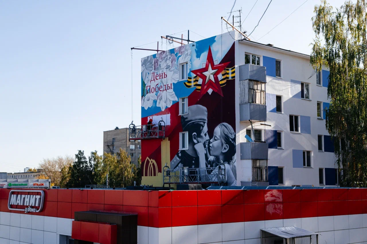 К 80-летию Победы в Великой Отечественной войне в Набережных Челнах появится два новых тематических мурала. Их разместят в районе Вечного огня, на фасадах домов 4/7а и 4/10. На одном из них работа уже почти завершена, второй мурал начнут оформлять со дня на день. Фотограф издания запечатлел на месте несколько кадров.