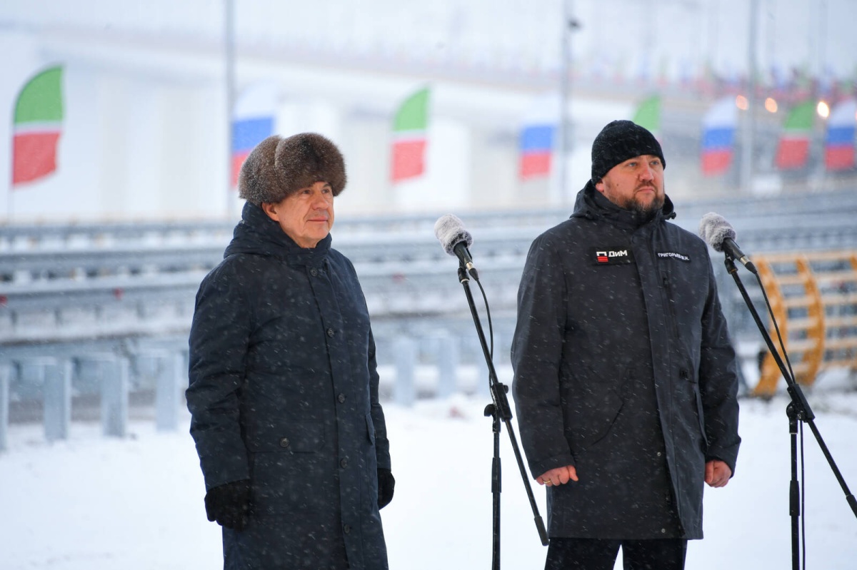 - Участок на трассе М7 протяженностью 81 км – обход городов Набережные Челны и Нижнекамск – который включает 10 мостов, - сказал Рустам Минниханов. - Вот мы сейчас стоим как раз – мост через Каму в 1 км 300 метров. И конечно пять транспортных развязок, 11 путепроводов, четыре многофункциональных центра, полностью подготовлены менее чем за три года.