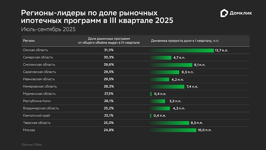 Рыночная ипотека демонстрирует устойчивые показатели в регионах с большой долей вторичного жилья. По итогам III кв. регионом-лидером по доле рыночных программ в общем объеме выдач стала Омская область, где на базовую ипотеку пришлось около трети рынка (31,3%). В этом же регионе установлен наибольший прирост доли рыночной ипотеки (+13,7 п.п. к началу года). За Омской областью с небольшим отставанием следует Самарская область (30,3%). В Смоленской (29,6%), Саратовской и Ивановской областях (обе – по 29,5%) показатели практически идентичны.