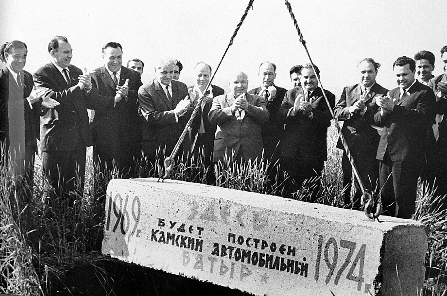 «Было исследовано, по - моему, более 60 площадок. И мы уж как-то попали под конец со своим предложением: «Давайте рассмотрим нашу площадку в районе Набережных Челнов». Затем приехала летом бригада из Госплана. В состав этой бригады входил и академик Владимир Дикушин. Мы ему показали места. Владимир Иванович очень придирчиво считал, сколько солнечных дней у нас, сколько солнечных дней, положим, там на Оби, так место называлось. Какая средняя температура здесь, какая-там… Какая роза ветров там, какая – здесь. И в общем, он пришел к выводу, что район на Оби и район в Набережных Челнах вроде бы по климатическим условиям не различаются… Затем было заседание экспертной комиссии, на которой были представители многих областей, после этого заседания вопросы были рассмотрены в центральных органах, и затем приехала группа ответственных работников, которые уже своими глазами хотели посмотреть площадку. Вот сели мы из Казани до Челнов в самолет, и, когда прилетели в Челны, Петр Непорожний подходит и говорит: «Давай, готовь камень, и чтобы на камне было написано: «Здесь будет построен Камский автомобильный завод». Но мы написали: «Здесь будет построен Камский автомобильный батыр, 1969-1974 годы». Вот так, собственно, был положен первый камень».